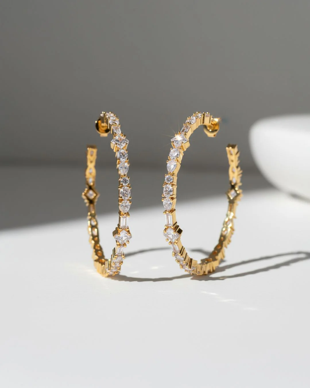 De zirkonia-steentjes hebben verschillende vormen, wat de oorbellen een speelse twist geeft. Dit goudkleurige design heeft transparante witte steentjes.