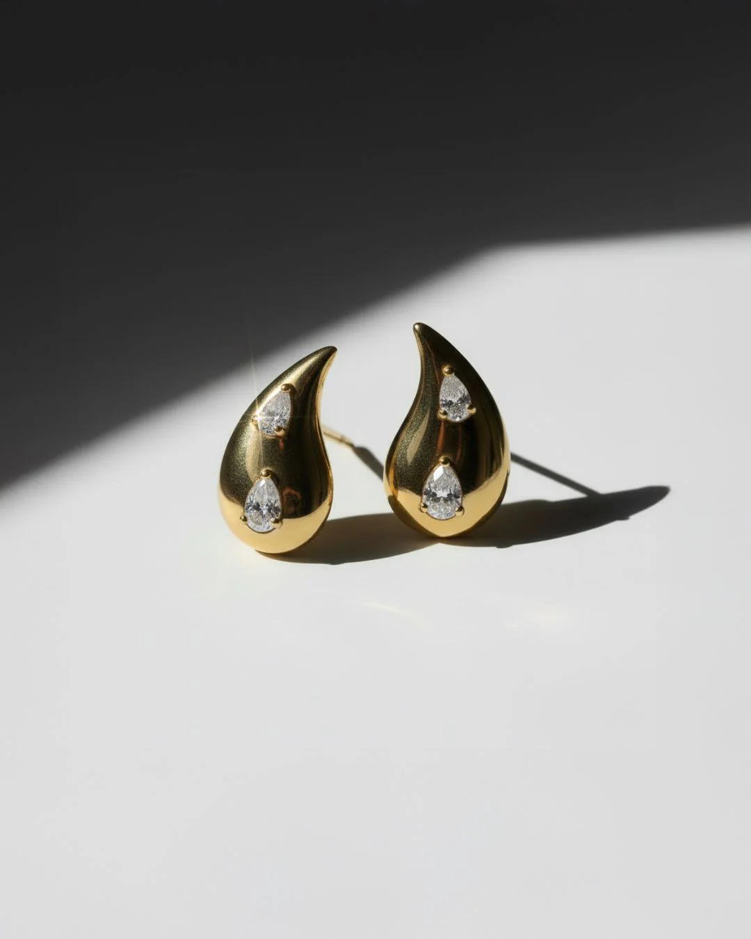 Op zoek naar een vleugje verfijnde elegantie? De Valentina Studs bieden de perfecte mix van klassieke glitter, modern minimalisme en tijdloze glamour. Hun vloeibare goudachtige vorm biedt de perfecte hoeveelheid glitter en de gebogen stijl lijkt op een ontwerp dat op natuurlijke wijze over het oor stroomt. De Valentina Studs zijn het meest veelzijdige luxe-item; of ze nu worden gedragen voor een chique alledaagse look of een verheven avondensemble, ze voegen een vleugje verfijning toe. Ze zijn ideaal voor zowel feestelijke evenementen als alledaagse glamour.